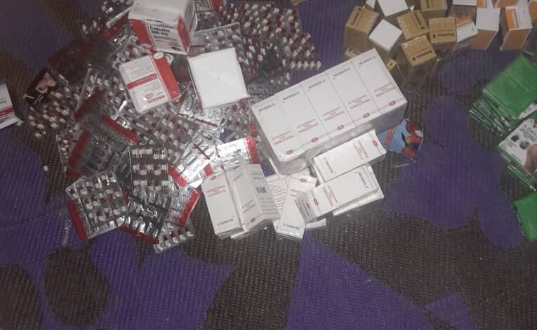 ومن بين الأدوية المضبوطة 10 صفائح من بريغابالين (Pregabalin)، و50 علبة من تراموكينغ (Tramoking)، و30 من باراسيتامول (Paracetamol)، و40 من حبوب منع الحمل، و23 من سيبروميد (Cipromed)، و56 من بيورغراي (Puregrey).